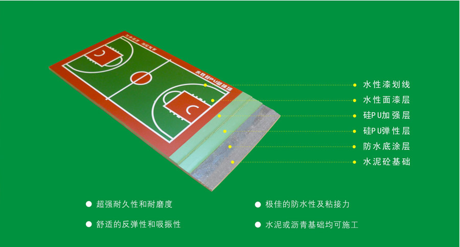硅PU球場(chǎng)材料,具有多功能運(yùn)動(dòng)性和施工優(yōu)勢(shì)的國(guó)家專利球場(chǎng)材料。通過(guò)改性硅彈性粒子等技術(shù),實(shí)現(xiàn)PU材料可直接在混凝土地面施工。且不會(huì)出現(xiàn)開裂和鼓泡現(xiàn)象。環(huán)保:本產(chǎn)品各頂指標(biāo)均達(dá)到GB18581-2001《室內(nèi)裝飾裝修材料有害物質(zhì)限量》標(biāo)準(zhǔn),并取得環(huán)保證書。產(chǎn)品在使用和施工過(guò)程中,均不產(chǎn)生有毒有害物質(zhì),是一種真正環(huán)保產(chǎn)品。