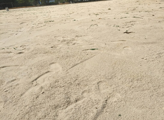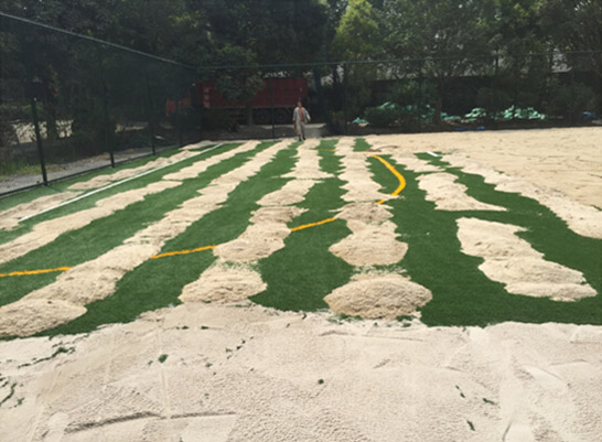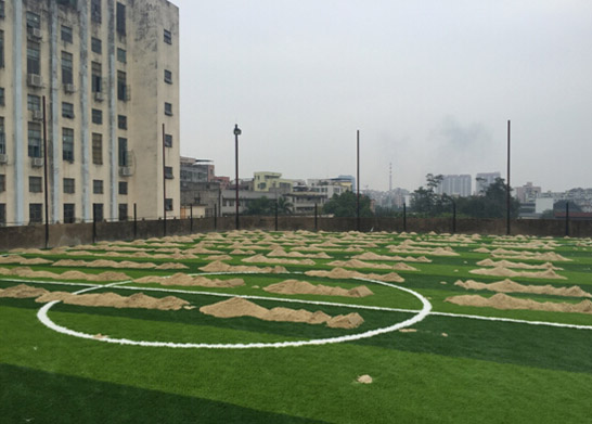1、石英砂除了提高場地彈性外,其中主要作用就是保護草纖維,沒有石英砂的保護,人造草在足球這種高強度的運動下很快就會脫落和磨損,所以填充適量的石英砂必不可少,以50mm草高為例,最低填充石英砂不少于25kg/㎡,而最多則可以達到35kg/㎡.但是填充過多石英砂又會影響顆粒的填充,因此筆者認為填充30kg/㎡比較適中。